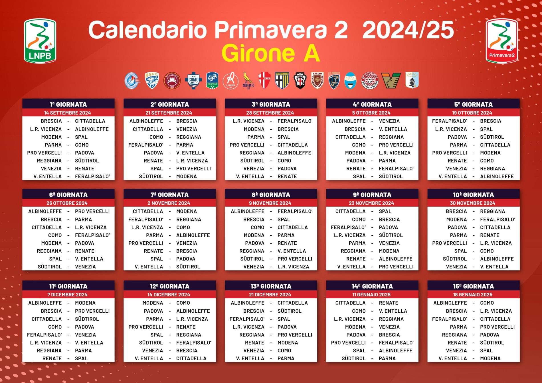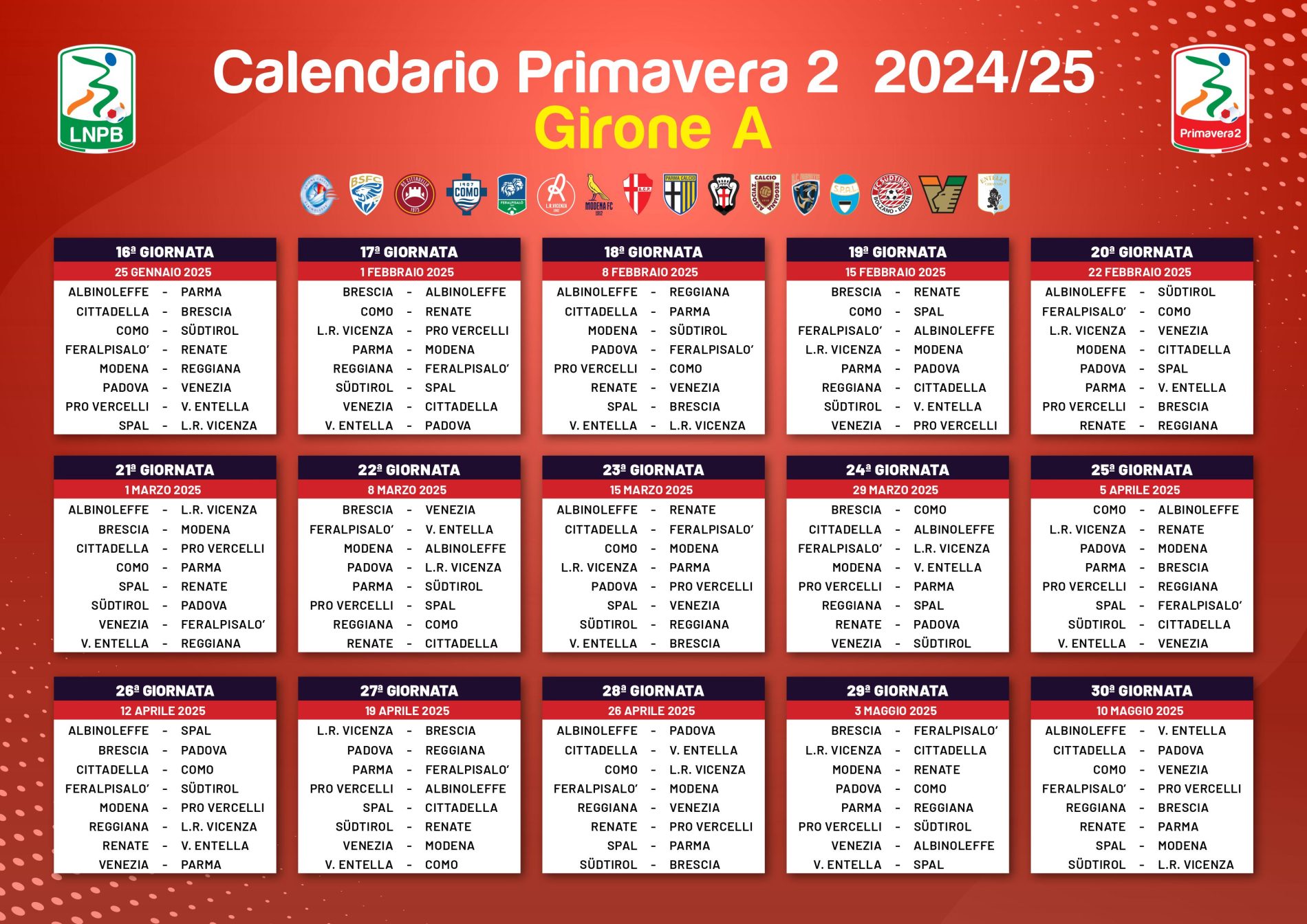 Questa la composizione del Girone A che vedrà protagonista la Primavera biancazzurra: Albinoleffe, Brescia, Cittadella, Como, Feralpisalò, L.R. Vicenza, Padova, Parma, Pro Vercelli, Reggiana, Renate, SPAL, Sudtirol, Venezia, Virtus Entella.